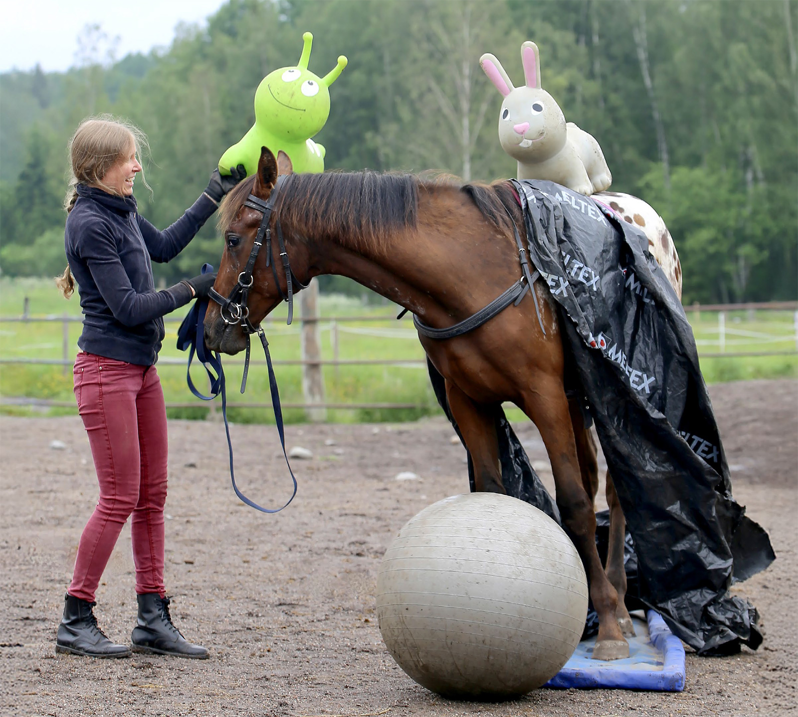 ”Iästä riippumatta hevonen on utelias eläin ja sillä on tarve tutkia uusia asioita sekä halu poistua mukavuusalueeltaan omassa tahdissaan. Pelottavien asioiden tutkiminen rauhassa ja rennosti kehittää myös hevosen rohkeutta”, kertoo Meri-Tuuli Mustonen ja muistuttaa, että kaikkeen hevosen käytökseen on aina jokin syy.